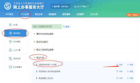 1. 毕业生登录“江苏省人社厅网上办事服务大厅” (https://rs.jshrss.jiangsu.gov.cn/index/),选择“个人办事”,在“就业创业-就业补贴-求职创业补贴个人申报”项目中,点击“申报”。
