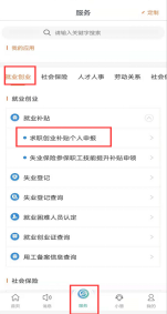 2.毕业生通过“江苏智慧人社”App进入,点击页面下方的“服务”,在“就业创业-就业补贴-求职创业补贴个人申报”项目中进行申报。
