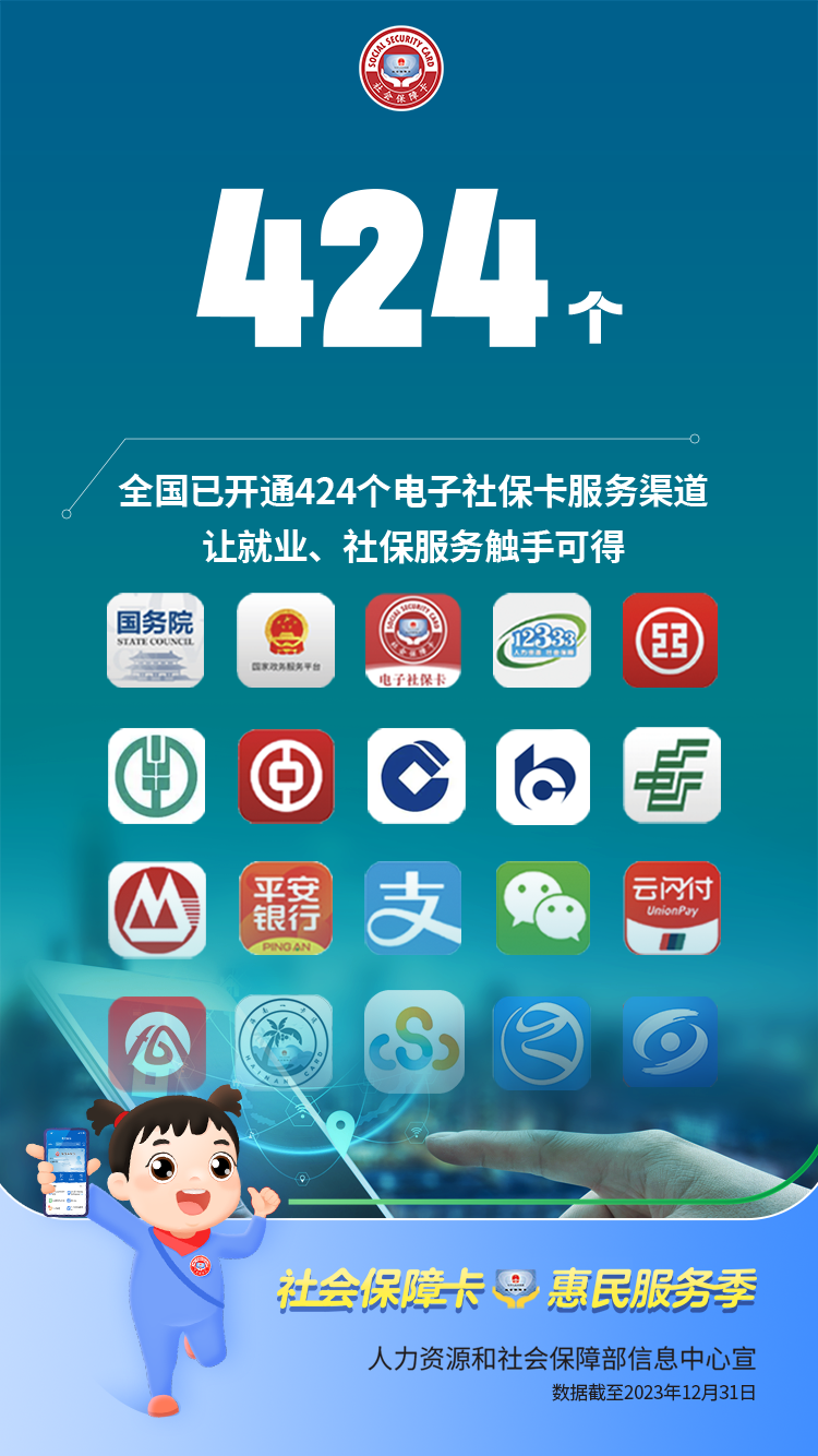 五、424个。全国已开通424个电子社保卡服务渠道,让就业、社保服务触手可得。