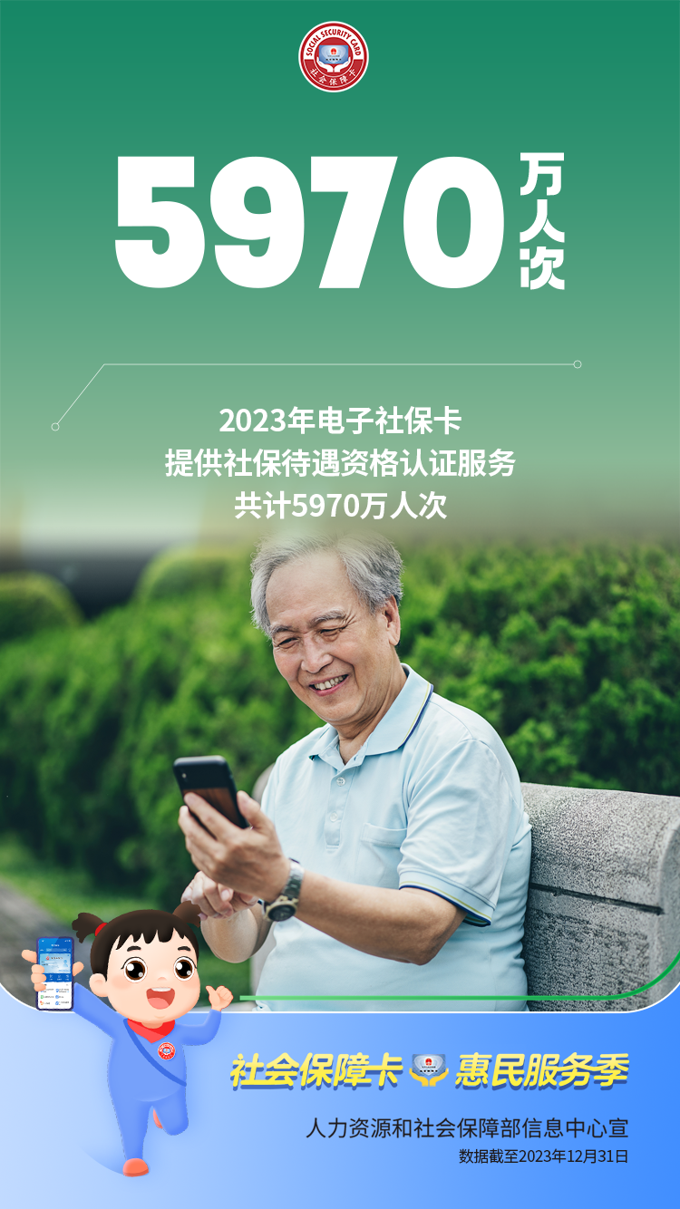 七、5970万人次。2023年电子社保卡提供社保待遇资格认证服务共计5970万人次。