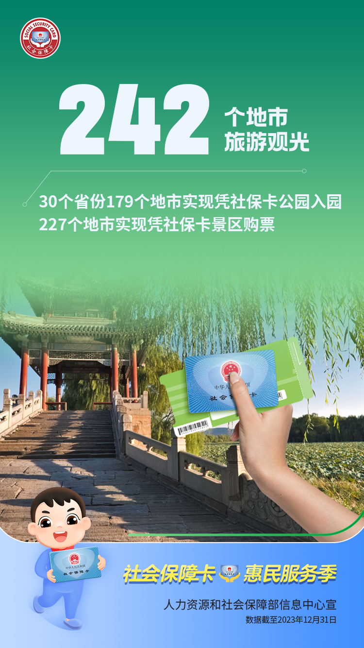 四、242个地市旅游观光。30个省份179个地市实现凭社保卡公园入园,227个地市实现凭社保卡景区购票。
