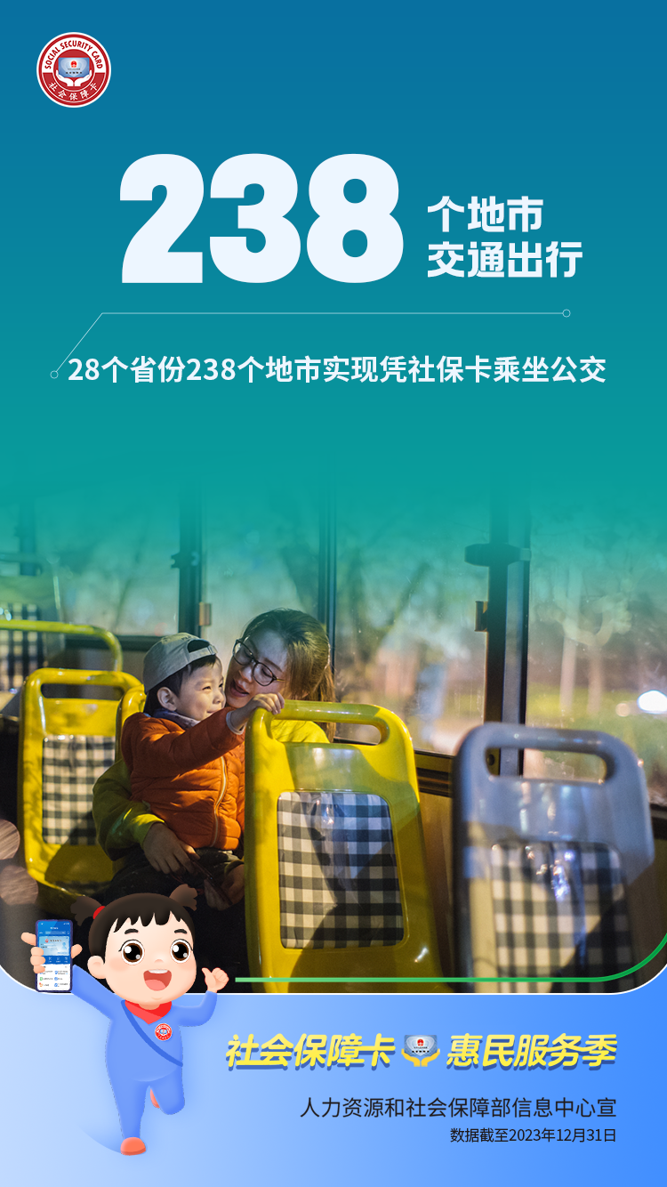 二、238个地市交通出行。28个省份238个地市实现凭社保卡乘坐公交。