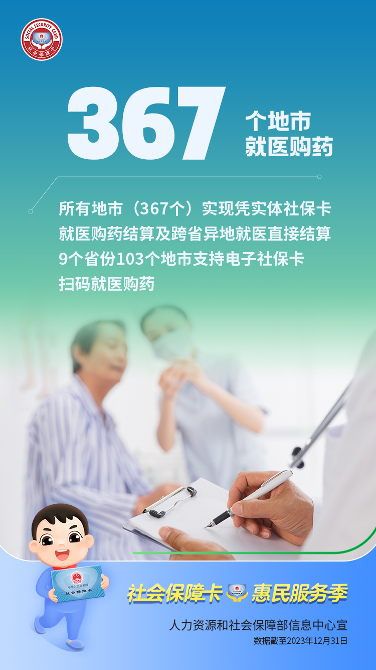 一、367个地市就医购药。所有地市(367个)实现凭实体社保卡就医购药结算及跨省异地就医直接结算,9个省份103个地市支持电子社保卡扫码就医购药。