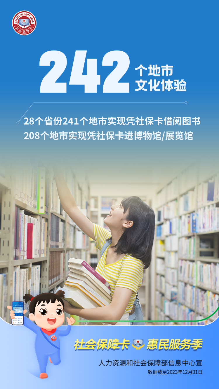 三、242个地市文化体验。28个省份241个地市实现凭社保卡借阅图书,208个地市实现凭社保卡进博物馆、展览馆。