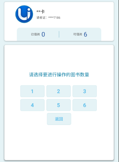 第二步:识别成功后,显示读者基本信息(姓名、证号与可外借数量),读者选择要借阅图书的数量,选择数量后在图书感应区放上图书会显示图书信息。